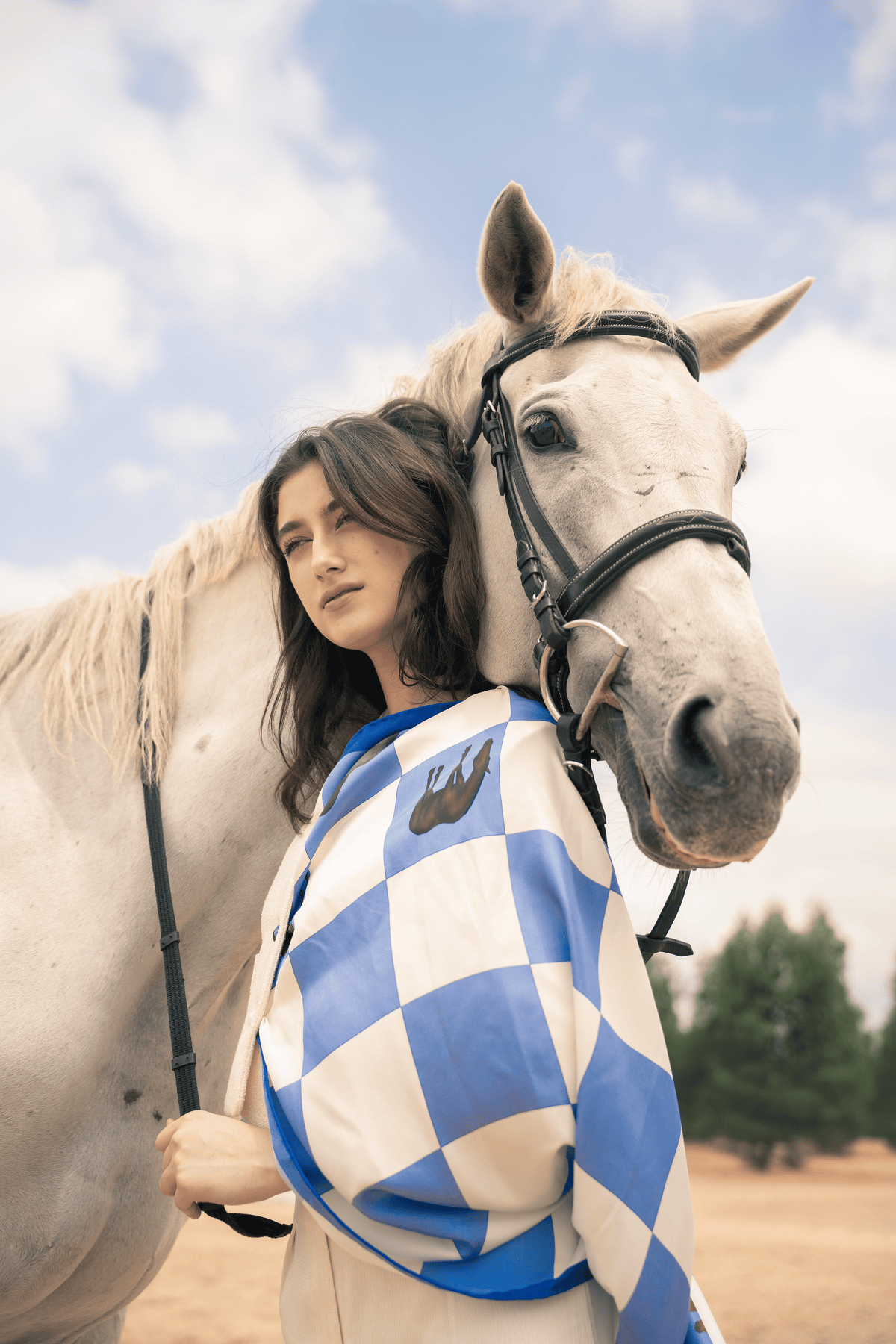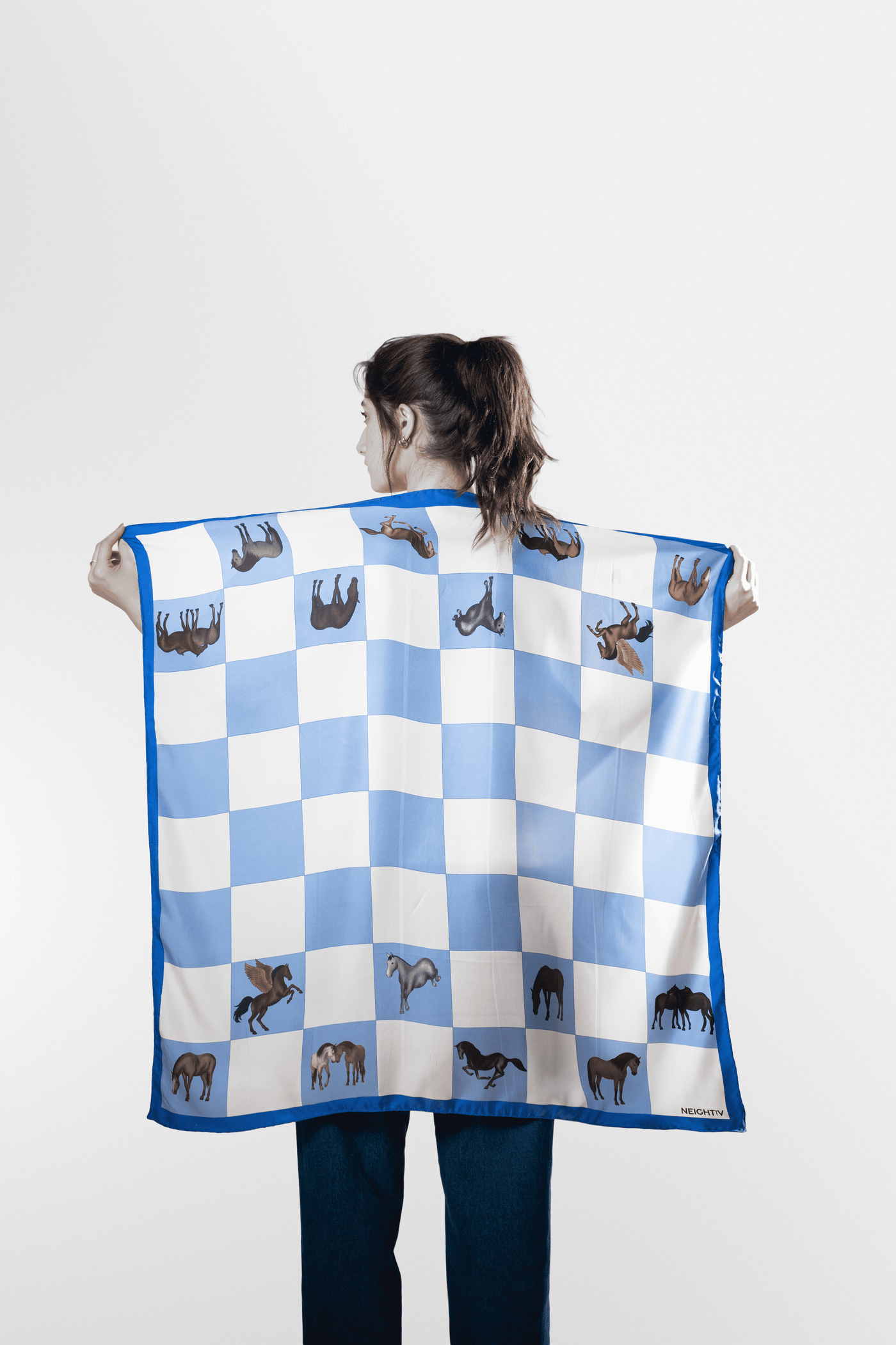 The Hoofboard scarf features our Equine companions in their Natural spirit, in a structured rhythm of the chessboard.